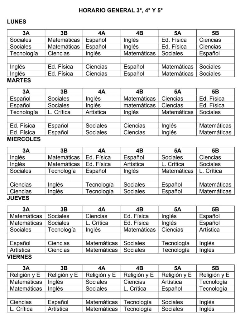 Horario 2026 – Primaria (3°, 4° y 5°)